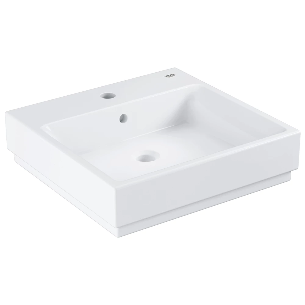 Wash basin 50 makes a bold visual statement backed up by all-round design excellence – flat back side glazed, 1 hole punched, 2 holes pre-punched, with overflow, 500 x 490 mm, including fixation set, sanitary ware, With GROHE PureGuard anti-scale coating and anti-bacterial glazing