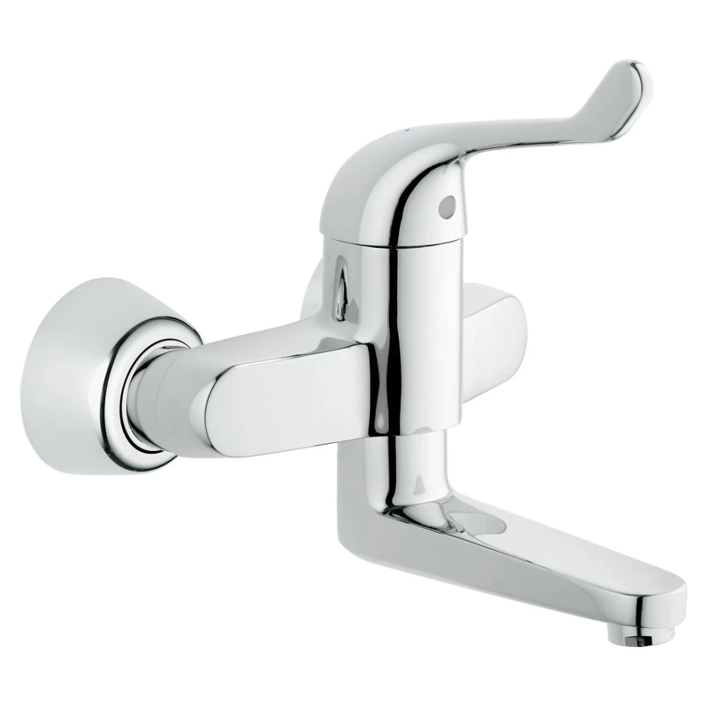 wall mounted, GROHE Long-Life finish, maximum flow rate (at 3 bar): 8 l/min, ceramic cartridge, adjustable flow rate limiter, adjustable temperature limiter, adjustable minimum flow rate 6 l/min., cast swivel spout, lockable with flow straightener, projection 197 mm, metal lever, lever length 120 mm, S-unions