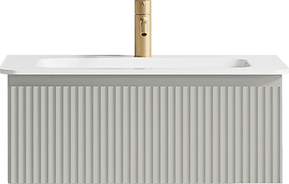 The Fabulous Small Soft Grey is a wall-hung cabinet that brings a refined, hotel-inspired aesthetic to the modern home. Its warm blush-toned cabinet is dressed in a fine vertical fluted texture, paired with brushed grey trim and hardware for a combination that feels both contemporary and luxurious. The standout feature is the striking granite-look countertop — bold in its black and white veining, it creates a dramatic contrast against the soft blush cabinet below.