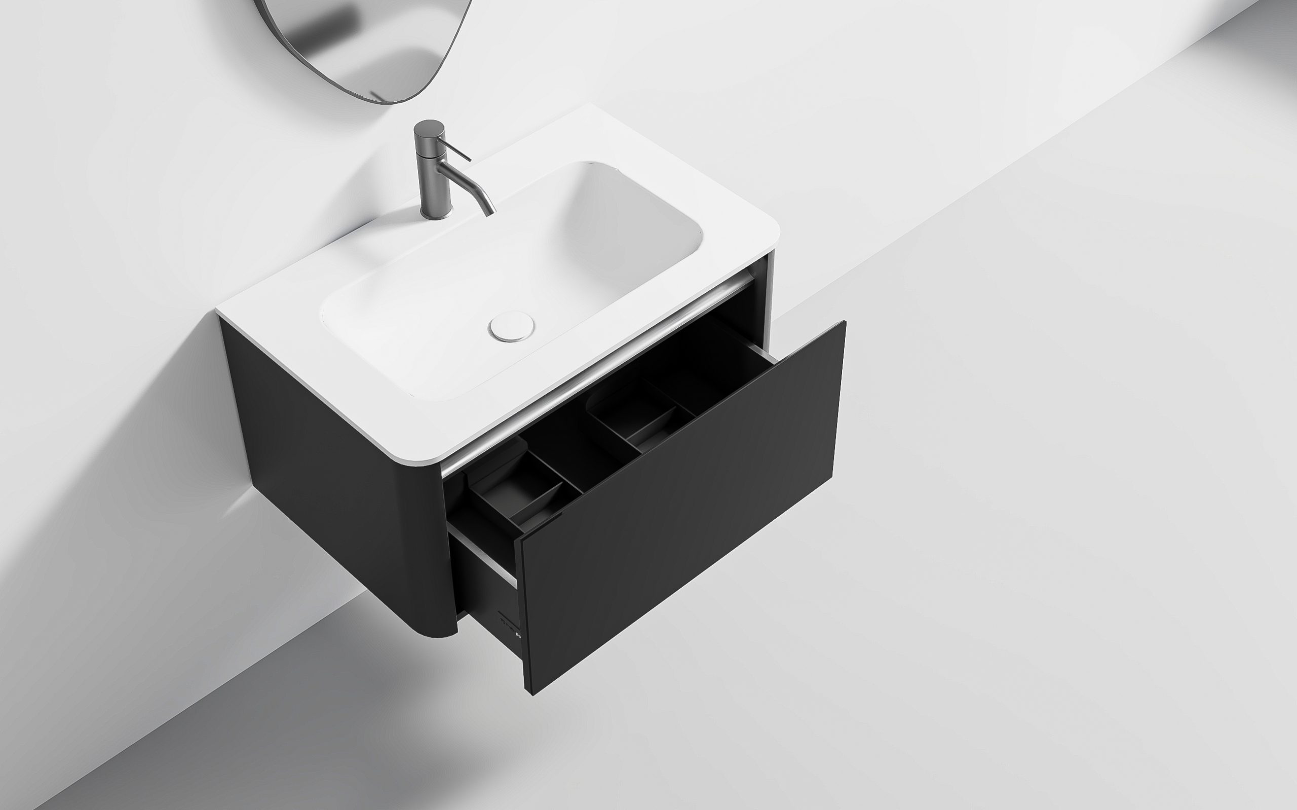The Midnight Black Cabinet that makes a confident, no-compromise statement in modern bathroom design. The deep matte black cabinet with softly rounded corners creates a bold yet refined silhouette — one that commands attention without overwhelming the space. The integrated white basin top sits seamlessly over the cabinet, its clean curves and soft-square basin bowl forming a sharp contrast against the dark body below.
