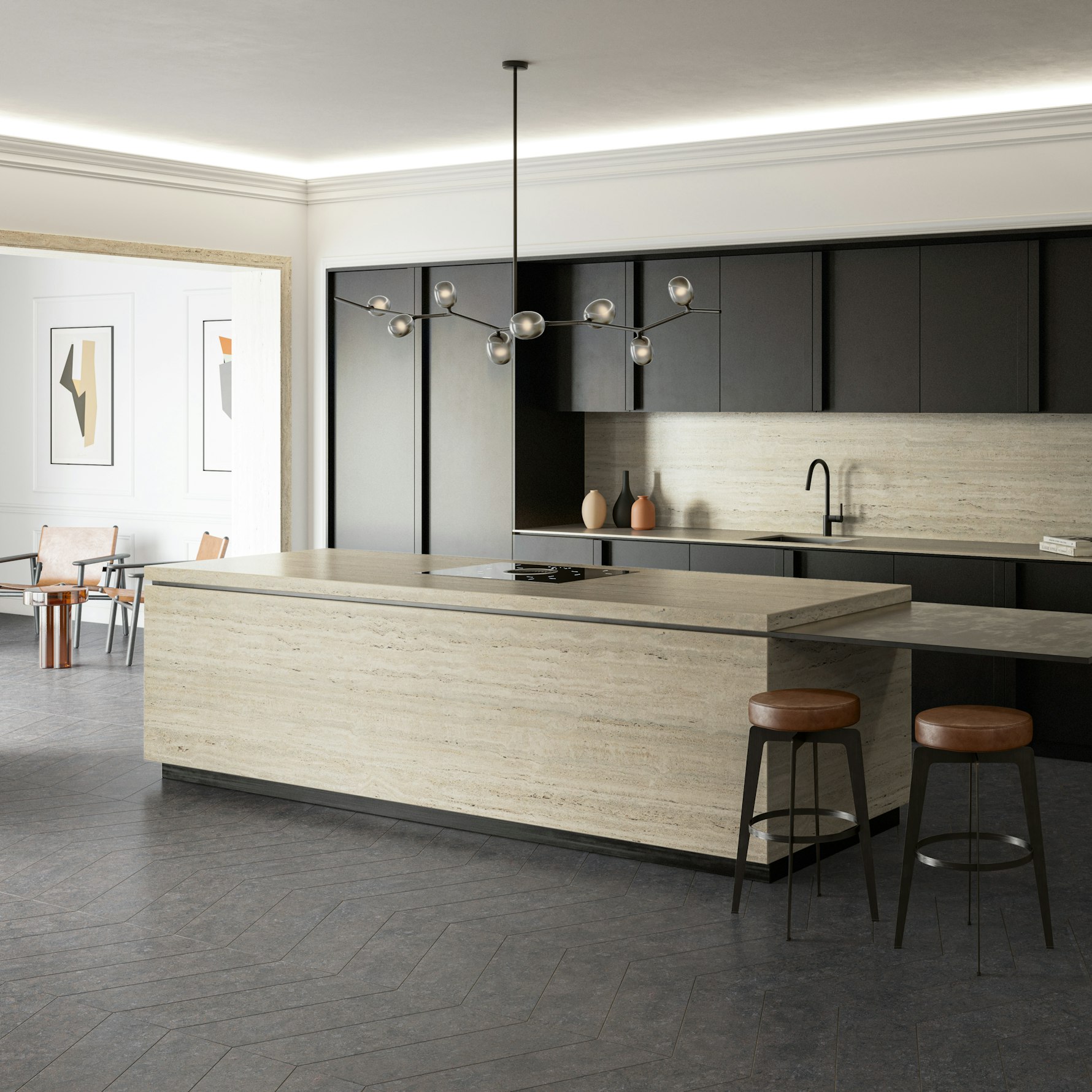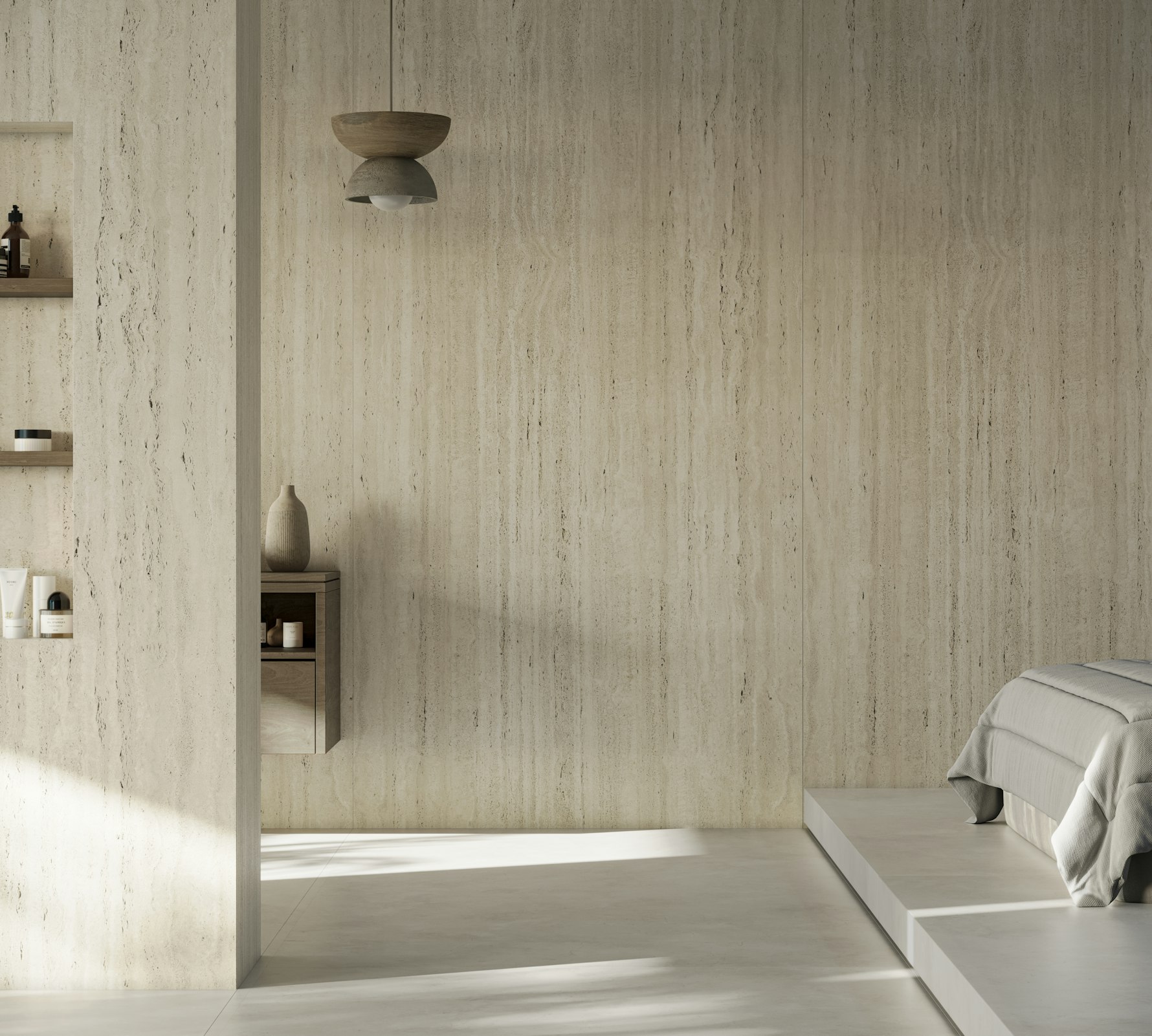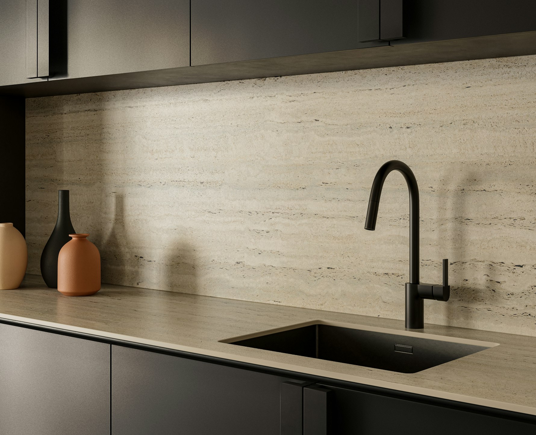 The hyper-realistic graphic of this colour perfectly recreates the depth of open- pore Roman travertine, but with a non-porous finish that increases strength and beautiful irregularities that add a timeless uniqueness to any design.