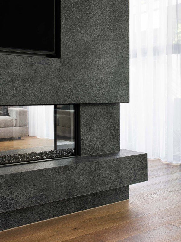 The natural finish on the slab enhances the fine-grained texture of this material, creating a beautiful sensory experience. The neutral, homogeneous colour of Slate Black natural makes for a versatile material perfectly suited for dark, rustic, and dramatic interiors or exteriors, or in areas where one would like to invite a natural, earthy, and organic aesthetic to the desired space.