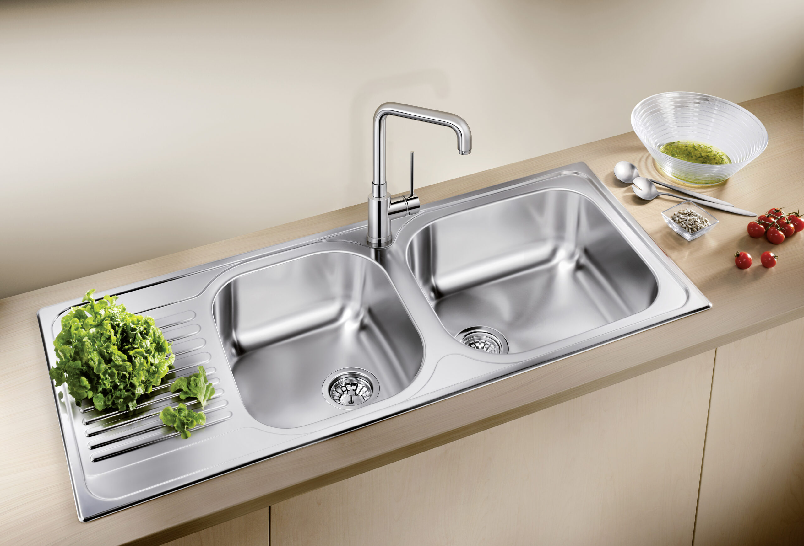 Functional design- Large bowl with additional bowl. Specific drainboard pattern. With 3 ½” stainless steel basket strainer- Can be installed reversibly